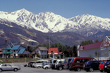 平成6年5月、国道148号線より白馬三山 |