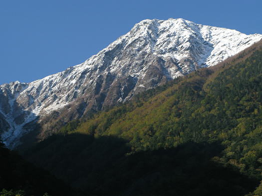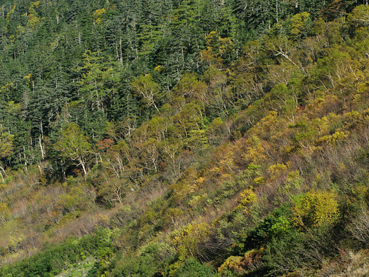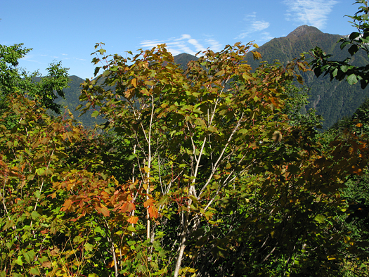 ナナカマドと北岳。いい年には鮮やかな朱色に染まるというが・・ どうも近年日本中の紅葉の色がおかしくなりつつあると聞く。地球温暖化との因果関係も言われている。とはいえ苦労して登って出会ったナナカマドだけに親しみを感じる。この標高2400〜500m地点で引き返すことにする。 |
