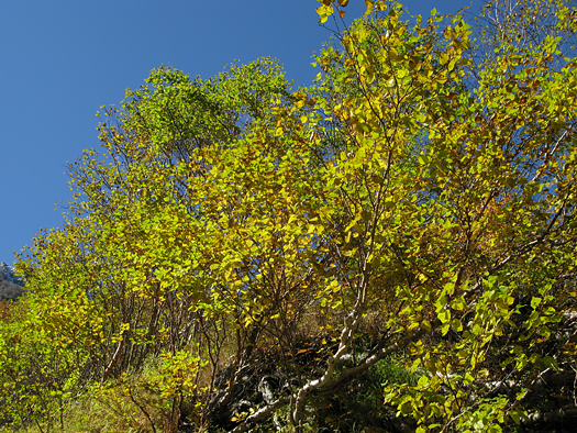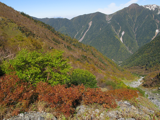 大樺沢は落葉樹が多い。紅葉前線は駆け足で下りていく。 |