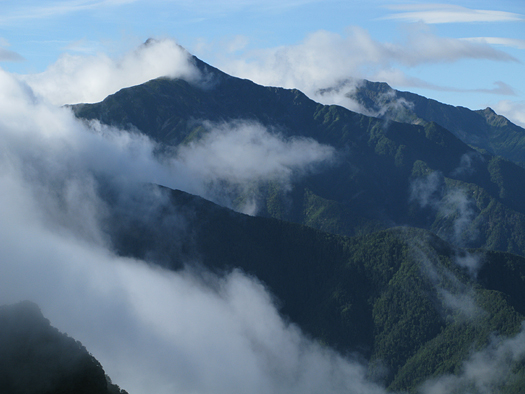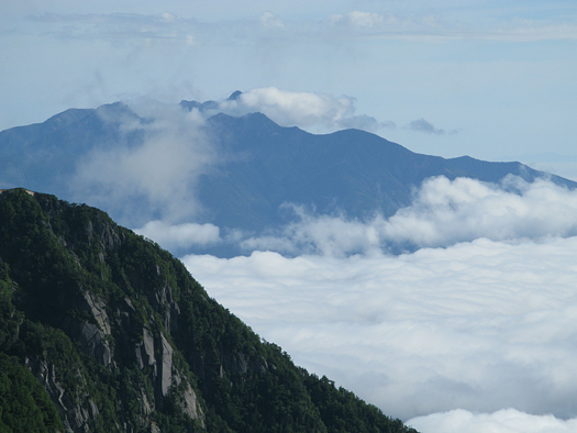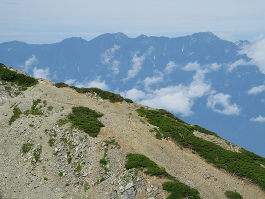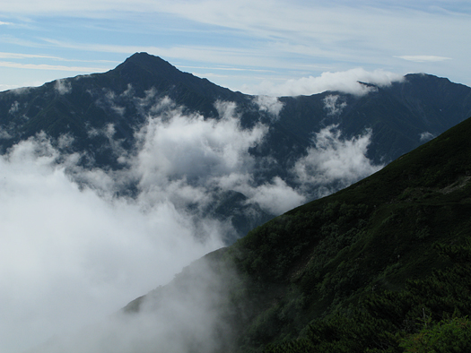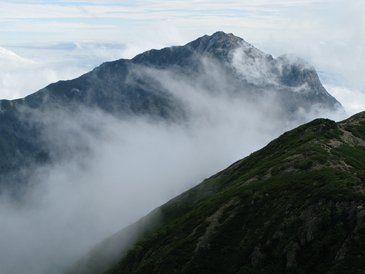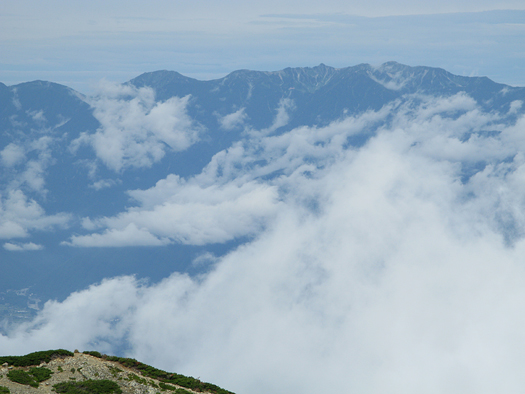 小雨の降る中出発。一旦五合目まで戻り小仙丈尾根から登る。分岐点に着いた頃雨はあがった。森林限界から上は少し寒く風があり雲が激しく動いている。鋸、甲斐駒など姿をあらわしついに白峰の稜線も雄姿を見せてくれた。力強さと優美さをもつこの山からはいつも大きな感動を与えられる。小仙丈岳から先はまさに雲上のプロムナード。3000mの稜線漫歩!