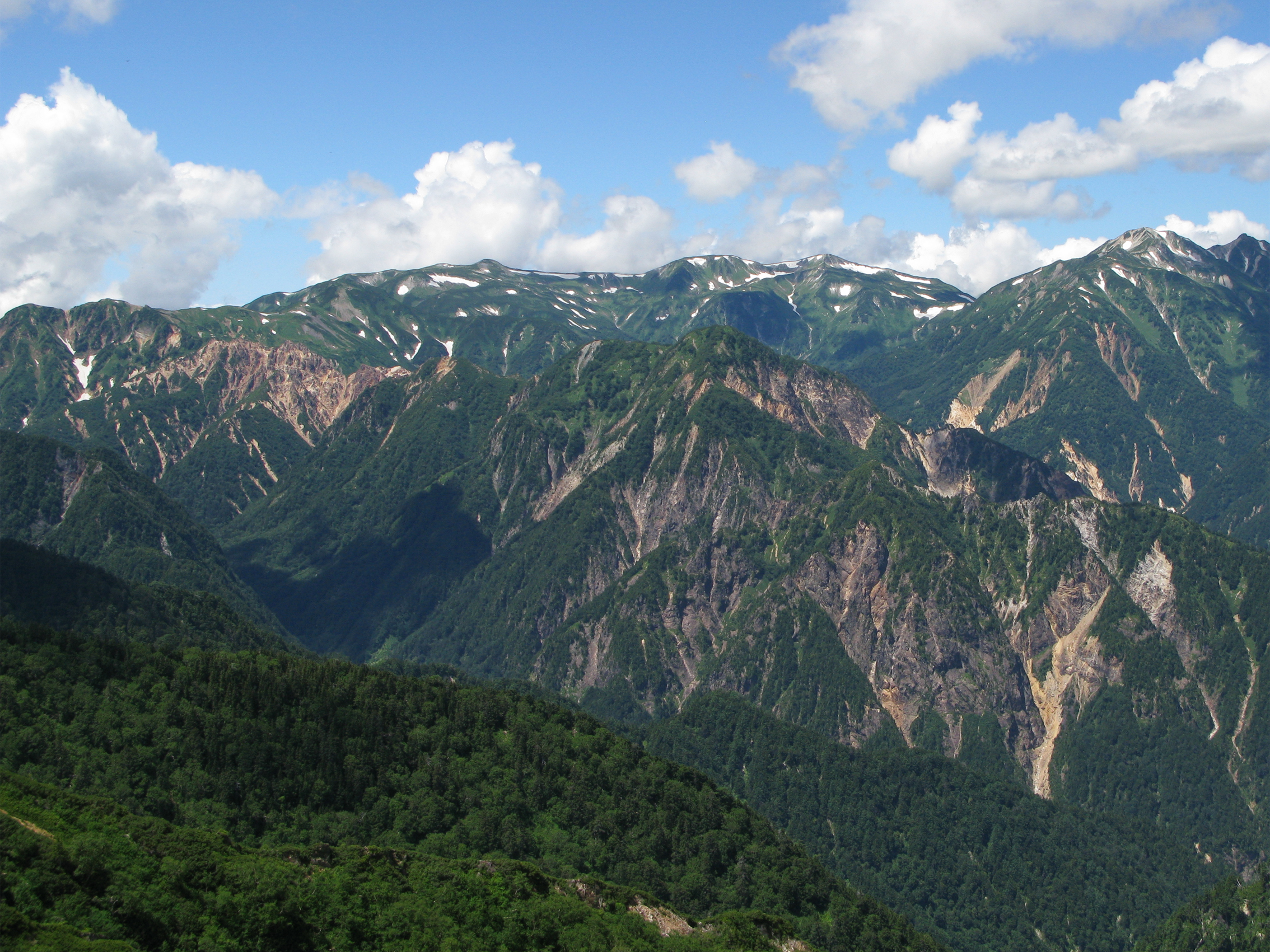 やや左から双六岳2860m、丸山、三俣蓮華岳2841m、鷲羽岳2924m、ワリモ岳、手前の岩山は硫黄岳2553m。