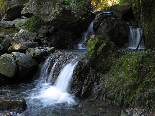 滝を一つ一つ写真撮りながら行こうなんてのんきに考えていたがそんな状況ではない。カメラをビニールに入れザックにしまいF2に取付く。左にクサリがあるが右の方が簡単そうだ。しかしやはり7割登ったところで行き詰まる。草鞋のフリクションがなんとも心細く感じられるのだ。左から登りなおすが濡れたクサリは思いっきり掴んでも滑る感じでこの沢を登っていく自信がゆらぎはじめた。 F2とF3の間にチョックストンのある水流多い小滝がある。この水流に阻まれ左から巻くことにした。判断ミスだった。崩壊で沢に戻れなくなり書策新道まで強引に登ることにした。足元の土がボソッ、ボソッと崩れて身の危険を感じる。自然を破壊しているではないか! なんとか這いつくばって書策新道に飛び出す。 作冶小屋で地下足袋ぬいだらトドメの不運。「うわっ! 蛭だ!」 こいつにかまれると少量の出血だが何時間も止まらず 「今日はこういう日なんだ・・」 完敗。 |