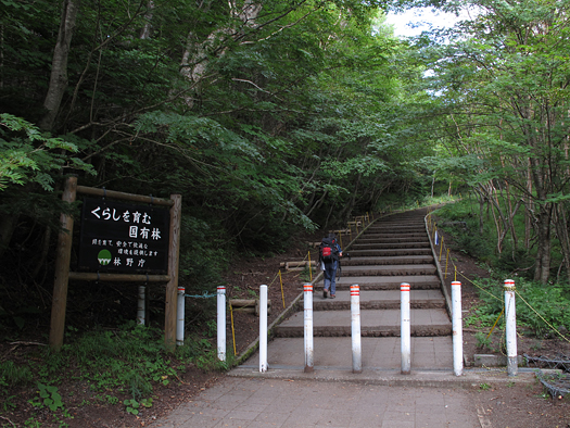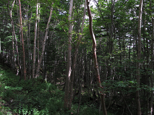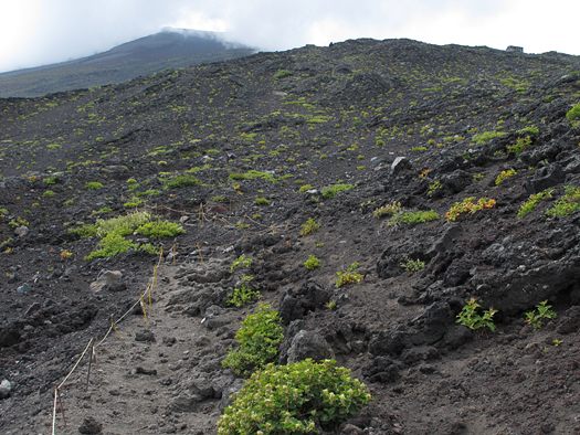 須走口登山道の原生林はなかなかイケている。奥秩父や南アルプスとは樹相が違う。背の高いダケカンバが多くシラビソは少ない。足元は軽石でなんか違う世界の山登ってるみたいだ。 |