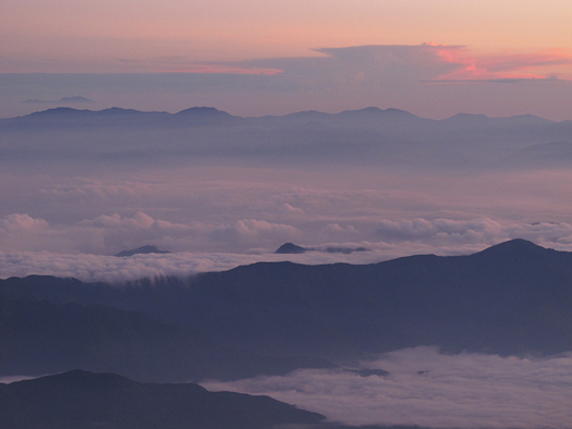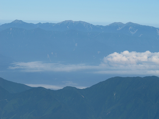 金峰山(左)〜雁坂峠。手前右は黒岳、真ん中のちょこんと出てるのは釈迦ヶ岳。 |