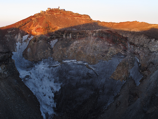お鉢の底。白いのは雪。北西に平地と小さい火口がある。富士山の頂上は意外と複雑な地形をしている。東の火口壁は断崖絶壁、恐ろしい。 |