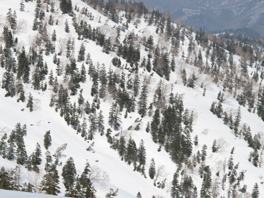 下りでルート外のシュプールをたどってしまい途中で気がつく。はっきり分かるところまで引き返しグリセードもどきでガンガン滑って行く。一カ所急斜面がありアイゼン着用、団子落としをちょっとサボッたら転倒。残雪期のアルプスに登るにはプレート付きのアイゼンがほしい。