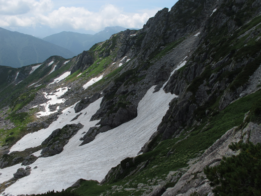 写真だと距離感がつかめないがかなりでかい。これは氷河だろうと思った。表面の雪を掘ったら古い氷の塊が出てくると思った。しかし野口五郎岳の稜線から見ると北アならどこにでもある小さな雪渓にしか見えなかった。 |