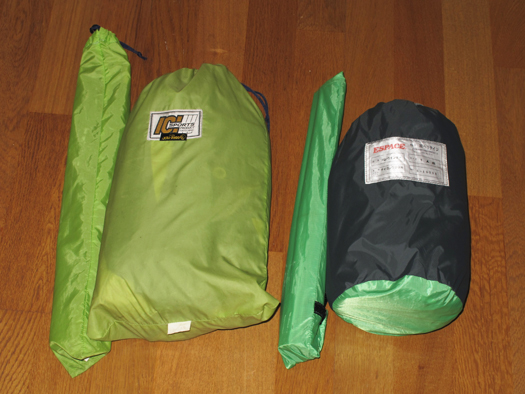 (左)買って22年たつICIゴアライト。当初バイクツーリングをメインに考えていたので2〜3人用を買ったが、山でもずいぶん使った。欧州アルプスでも活躍し愛着あるので処分不可。(右)昨年とうとう新しいやつを買ってしまった。どれにするかずいぶん迷ったがヘリテイジソロウィンターに決まり。内張り方式で吹き流しが付いているタイプ。冬は大変使い勝手よい。夏は内張りを外しフライシートを掛けるが少々鬱陶しい。しかし軽いのは良い。黒部源流はこれで行った。設営しやすいよう数か所に細引きを付け細工してある。